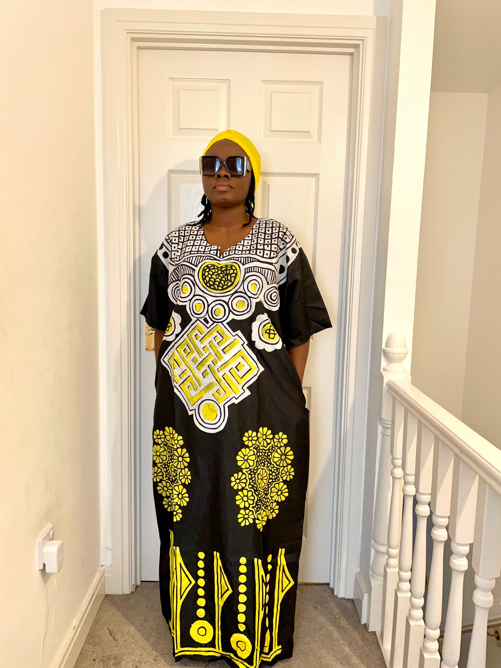 Designed for the modern queen who carries her heritage with pride, this kaftan blends authentic Adire artistry with a bold black and yellow palette that commands attention.